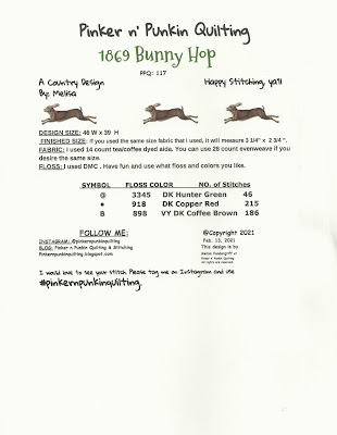 I created a little prim bunny stitch using only 3 floss colors. It is called 1869 Bunny Hop.