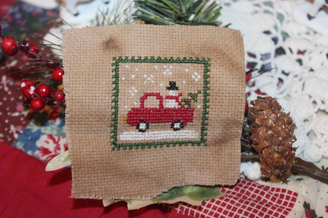 Last year, I stitched 15 ornaments in my Barnyard Christmas series. Soooo I decided to add another. This little stitch is called "Bringing Home the Tree" . There was a red truck in the series last year too.