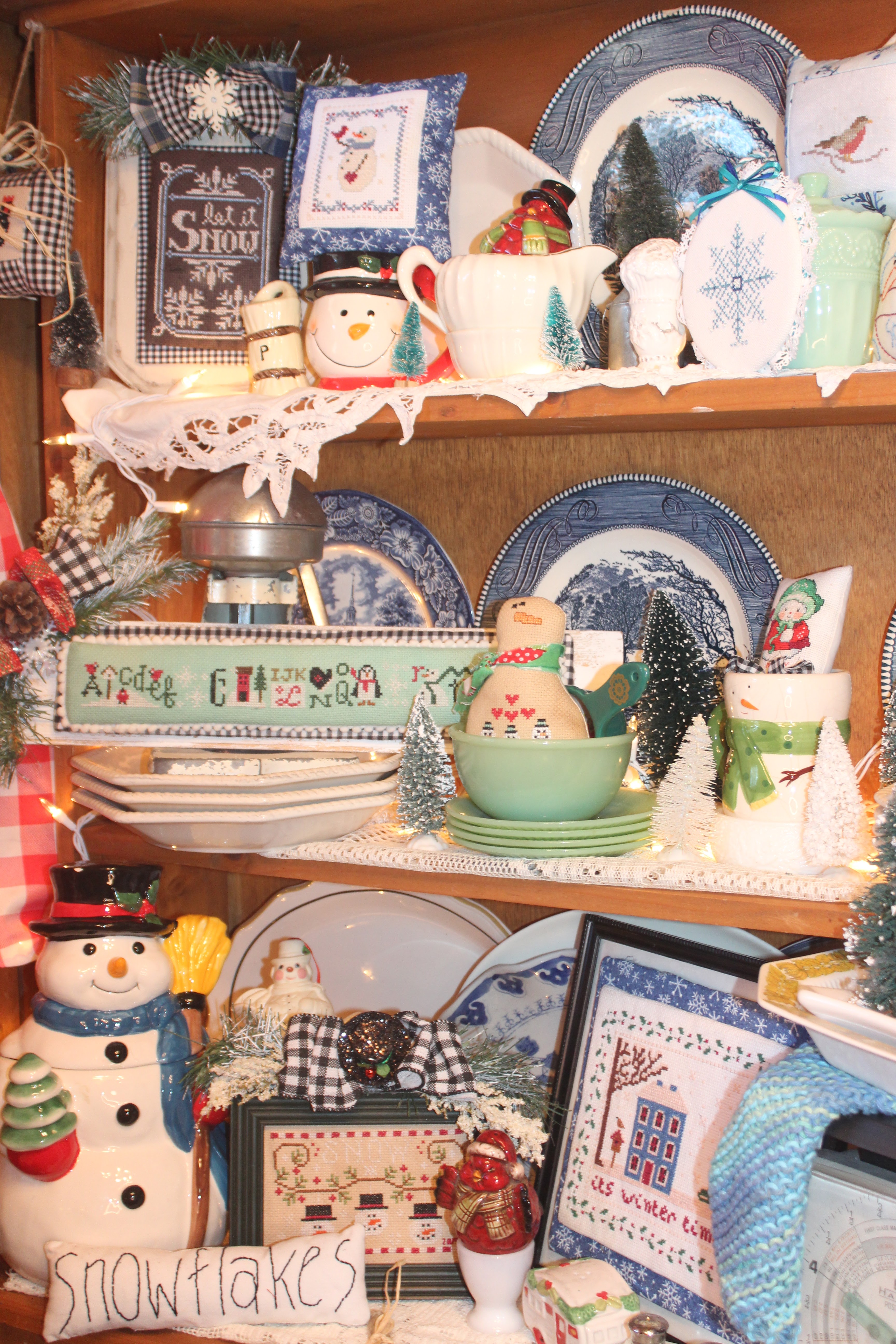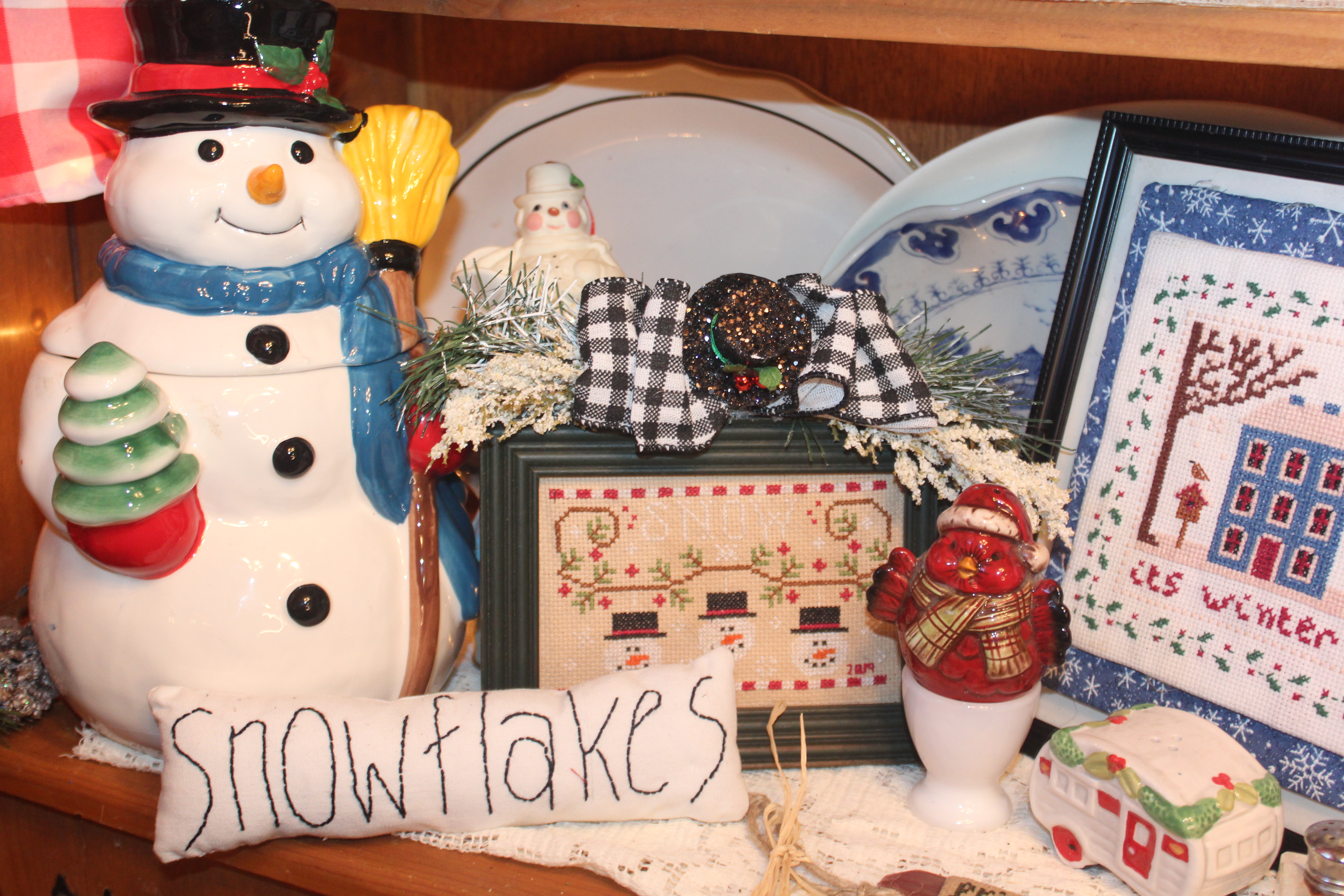 The bottom shelf sports a new snowman cookie jar that made its way all the way from Arkansas .๐๐งณ I bought it at the Goodwill last summer while traveling . This is his 1st year out.