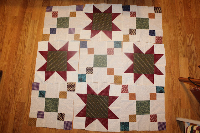 Well I thought I was only 1 week behind on dear Joy's QAL . Joy at Days Filled of Joy has been hosting a free Christmas QAL for the last 5 weeks. It has been so much fun. Yesterday, I realized I had not pieced WEEK 4's STEP so off I went to the sewing machine in a flutter. In a wink of an eye, I soon had four lovely star blocks completed.